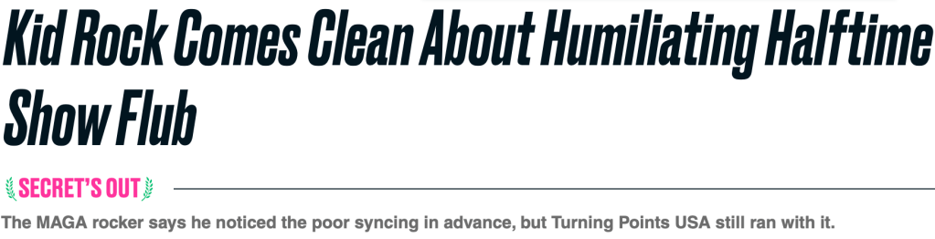 In Today’s Palate Cleanser, we learn that when it comes to unifying the country, MAGA holds the Super Bowl Halftime Show to a higher standard than the Presidency. I mean, it’s hard to tell which is worse, claiming a person you can’t understand is divisive or labeling fascism “America First?” Republicans are so dumb, I’m starting to wonder if they asked for Project 2026 to be graded on a curve. Meanwhile, Middle-Aged Rock (A more appropriate description of Kid’s decaying remains) spent his Super Bowl Sunday getting busted for lip-synching his own foreign-language hit “Bawitdaba, da-bang, da-bang, diggy-diggy-diggy.” Proving, the best way to honor Charlie Kirk’s legacy is to also choke on Turning Point USA’s biggest stage.