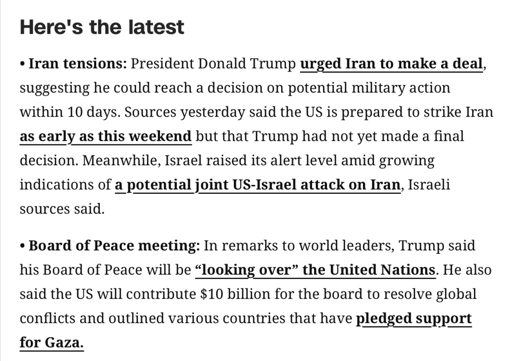 Today, Donald Trump held a “Board of Peace” gathering. Picture a collection of Skeletor-like warlords but with much thinner skin. And what, you ask, was so important to the MAGA “peace” agenda that required a murderous meeting of the mindless? The US and Israel are once again joining forces to bomb the sand out of Iran, which is about as even of a fight as 90’s Hollywood Hulk Hogan and Goldberg, Camel-Clutching the Iranian marching powder out of the Iron Shiek’s corpse. And yet this sudden sense of urgency to carpet bomb Iran into a Persian rug is raising more than just the Ayatollah’s unibrow. I mean, I thought Trump said he fixed the Middle East in 2018 when he tore up Obama’s nuclear agreement and single-handedly allowed Iran to build an all-you-can-eat-nuke buffet for the Israeli Iron Dome. Or back when he learned that he couldn’t even negotiate “concepts” of an agreement into a coherent thought, let alone a multi-national nuclear treaty. Leaving Trump stuck between Iraq and a hard place, with no other choice but to lie his way out of another unprovoked attack, where: “The victim had it coming!” So here we are, right back where we started, and only months removed from just the 2nd most embarrassing ‘Mission Accomplished’ in Republican history. So, either Trump is sticking with the crackhead definition of “winning,” or the Epstein cover-up has entered the Middle-East leg of the tour.