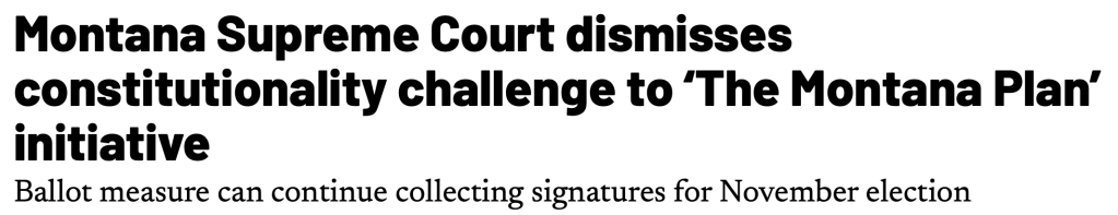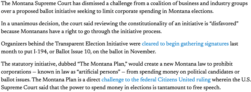 In today’s Palate Cleanser, we learn that Montana has devised a strategy to circumvent the Citizens United Supreme Court ruling, which ironically granted corporations in America more rights than citizens. Do you realize that Amazon can not only buy any election they desire, but can also receive a late-term abortion in Bum-F*ck Texas? But seriously, the one thing conservatives love more than corporate greed, and believing children can be stored in the freezer, because they’re the exact same thing as embryos, is states’ rights. So, this shit might just work. I haven’t seen a Montana game plan this brilliant since the 49ers won the 1990 Super Bowl. However, I do expect the Republicans to put up a better defense than the Broncos.