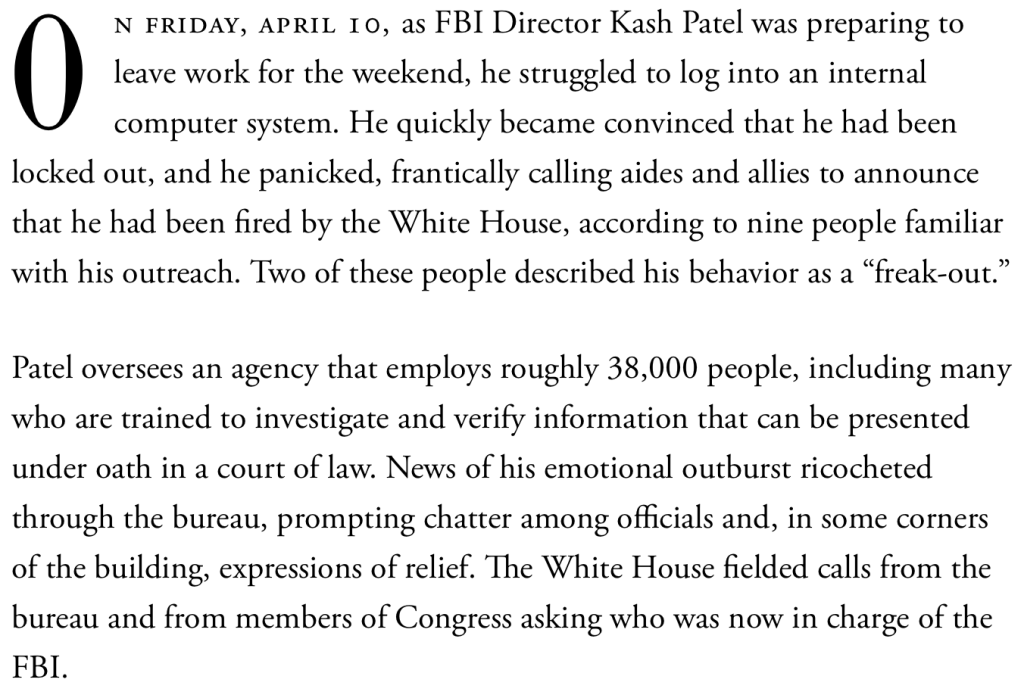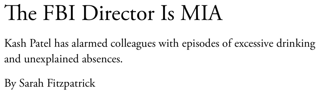 The Atlantic Article Quoted – https://www.theatlantic.com/politics/2026/04/kash-patel-fbi-director-drinking-absences/686839/